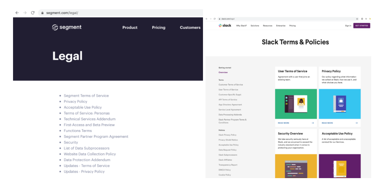 In the old days, like three years ago, you could start your company using just a Master Services Agreement and a Privacy Policy. Now, if you look at established startups’ legal documentation pages, you see epic lists of legal terms like these: