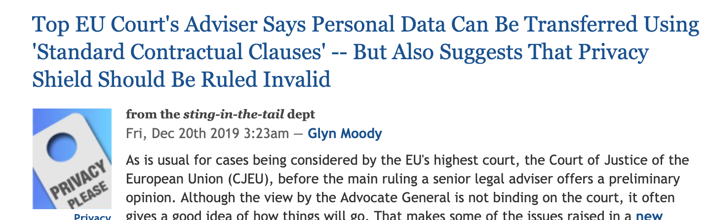 For example, "If the CJEU follows the AG's opinion, the practical outcome will be that there will be no material change in the options available to businesses for transferring personal data to non-EEA countries." But that conclusion assumes that the CJEU won't take up the Advocate General's implicit offer to rule on the validity of the Privacy Shield. However, if it does, that's bad!